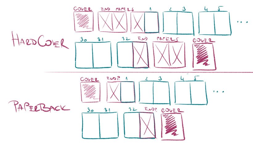 For now, let’s stick to the inside of the book (and the way we read — from left to right). In my template, I’ve also indicated the covers, but only for counting purposes. Covers — and what “hardcover” vs. “paperback” really mean, with all the tiny nitty-gritty details — will be a topic for another post. There’s a lot to say! 😄