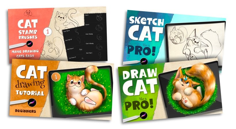 It all starts with a beginner-friendly coloring tutorial, complete with amazing stamps that make drawing a cat super duper easy. Then, we level up with a pro-level sketching guide and a pro-level drawing session, complete with special fur brushes and plant brushes. It’s a truly jam-packed combo for all the cat lovers out there!